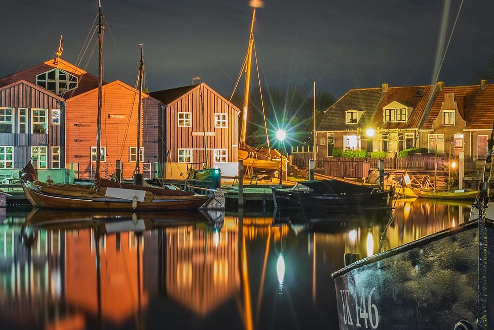 Der schöne Hafen der ehemaligen Zuiderzeestadt Elburg am Abend mit dem sich im Wasser schön spiegelnden Fuhrwerkshof. Die Beleuchtung des Botter-Kais macht dieses Bild zu einem stimmungsvollen Bild. Eine Schönheit, die man sich an die Wand hängen kann!