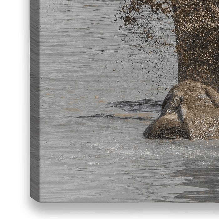 Ein Elefant gönnt sich eine Schlamm Dusche und trifft einen anderen Elefanten am Ufer