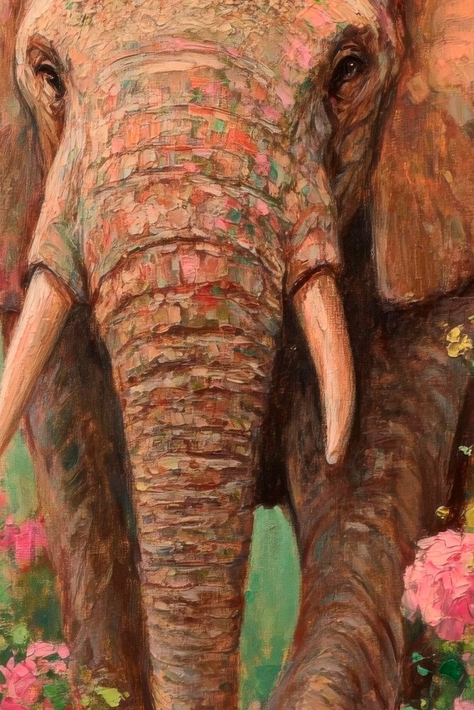 Mit majestätischer Präsenz bahnt sich ein sanfter Riese seinen Weg durch ein Meer aus blühenden Rosen. Die kraftvollen, aber sanften Ohren und die imposanten Stoßzähne strahlen inmitten lebendiger Farben. Dabei vermittelt das Bild eine harmonische Begegnung zwischen der Stärke der Natur und der zarten Schönheit der Flora, die ihn umgibt.