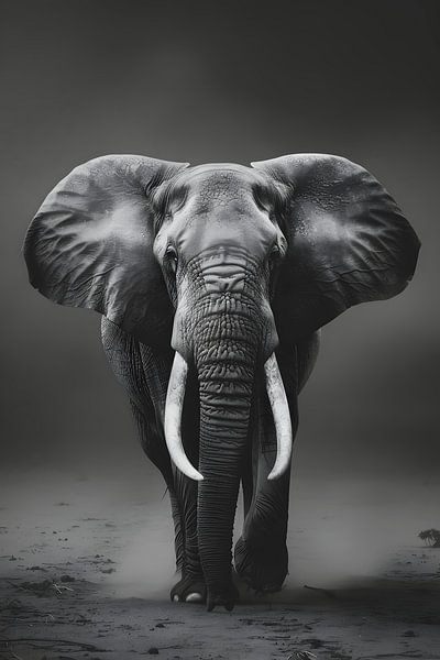 Eine Schwarz-Weiß-Fotografie eines im Sand laufenden Elefanten.