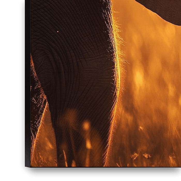 Sanfte Sonnenstrahlen umhüllen den majestätischen Elefanten, während ein zarter Moment der Neugier ihn zu einer Blume führt. Diese harmonische Verbindung von Natur und Tierwelt strahlt Ruhe und Anmut aus und ist perfekt für das Wohnzimmer, um eine friedvolle Atmosphäre zu schaffen und Gespräche zu inspirieren.