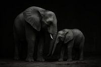 Zwei Elefanten stehen dicht beieinander in einem dunklen Raum, mit sanftem Seitenlicht, das Falten und Konturen betont. Das große Tier neigt sich leicht nach vorne, während das Kalb neugierig aufblickt, was die Verbindung zwischen den beiden spürbar macht. Die Schwarz-Weiß-Palette verstärkt den Kontrast zwischen Hauttextur und…