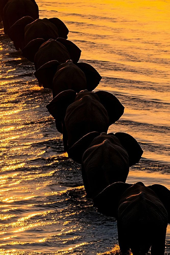 Dieses atemberaubende Foto zeigt eine majestätische Gruppe von Elefanten, die während eines bezaubernden Sonnenuntergangs in einer ruhigen Reihe durch einen Fluss laufen. Das warme, goldene Licht spiegelt sich auf dem Wasser und bildet einen atemberaubenden Kontrast zu den dunklen Silhouetten der Tiere. Dieses Bild strahlt Ruhe, Natur und Eleganz aus und bringt einen Hauch von exotischer Schönheit in jeden Raum. Dieses Foto ist perfekt für Tier- und Naturliebhaber und fängt den Zauber einer unberührten Welt in einem Bild ein. Ideal für die Dekoration von Wohn- oder Schlafzimmern, in denen ein Hauch von Wärme und Natur gewünscht ist.