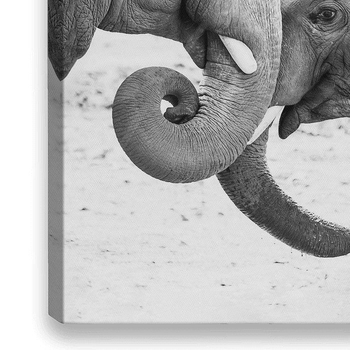 Findest du diese Szene nicht süß? Die beiden Elefanten drücken ihre Stämme gegeneinander, was zu einem schönen Bild führt. Ein Elefant ist ein großes und klobiges Tier, aber er ist auch sehr liebevoll, was den Ausdruck im Gesicht betrifft. Foto aufgenommen im Zoo von Antwerpen. Umwandelt in Schwarz-Weiß.