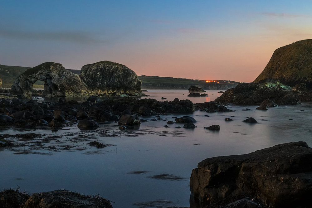 Op een olifant gelijkende rots in het water in de buurt van Ballintoy Harbour, aan de Antrim kust in Noord-Ierland. Lokaal bekend als Elephant Rock. 's Avonds laat gefotografeerd bij maanlicht.
