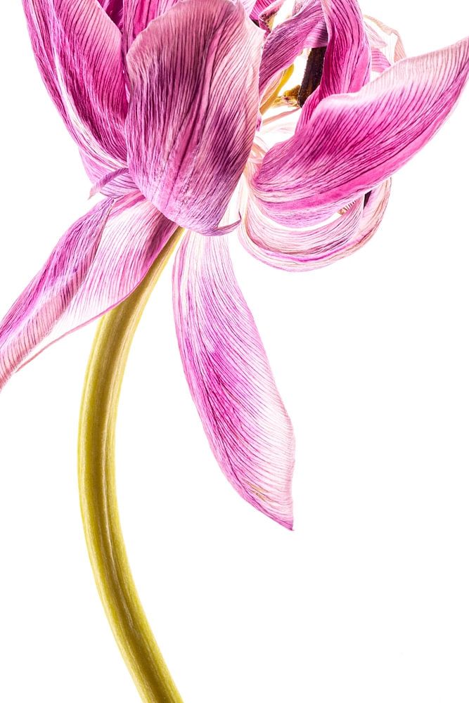 Die Tulpe stammt aus einem Strauß, der seine besten Tage hinter sich hatte. Doch Farben, die sich mit der Zeit verändern, behalten ihre Schönheit, und die Blume selbst gewinnt mit der Zeit sogar an Charakter. Mit dem Gegenlicht habe ich versucht, diese reine Schönheit in einem minimalistischen Bild hervorzuheben.