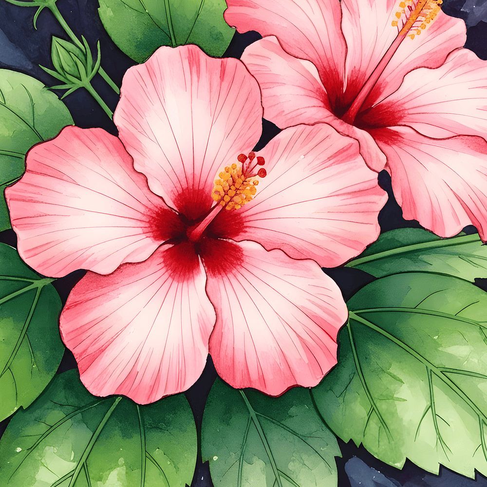 Eine zarte Illustration von zwei rosafarbenen Hibiskusblüten, umgeben von üppigen grünen Blättern, gemalt vor einem dunklen, kosmisch inspirierten Hintergrund. Das Kunstwerk verbindet natürliche Schönheit mit einem Hauch von Geheimnis und eignet sich für moderne Interieurs, Botanikliebhaber und Fans von Blumendekor.