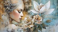 Elegante Frau mit Blumen - Dieses Frauengemälde zeigt eine sanfte, ruhige Frau mit geschlossenen Augen, detailliert mit Blumen und Juwelen in ihrem Haar, neben großen, naturgetreuen weißen und beigen Blumen auf einem Hintergrund mit blauen und beigen Tönen, die einen Hauch von antikem Charme ausstrahlen.