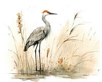 Eleganter Kranich - Dieses Gemälde zeigt einen anmutigen Kranich in einer friedlichen, natürlichen Umgebung aus Schilf und Wasser. Der Stil ist eher minimalistisch mit einem Hauch asiatischer Einflüsse, umhüllt von sanften Erdtönen und einigen auffälligen orangefarbenen Details.