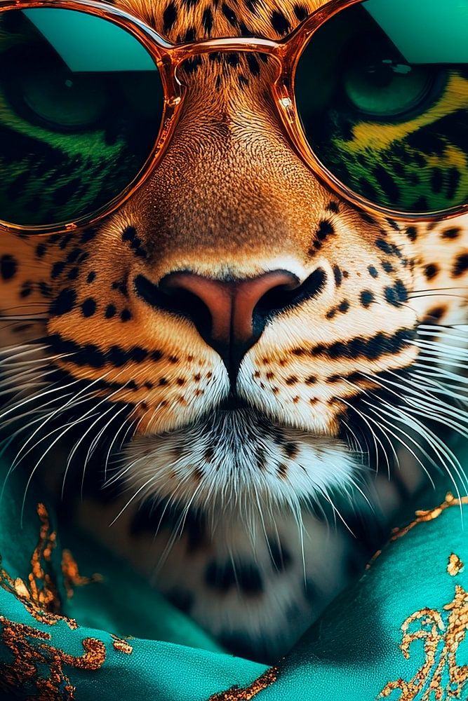 Ein schicker, stilvoller Jäger in Sonnenbrille und elegantem Schal strahlt eine unbeschwerte Coolness aus. Die Kombination aus kräftigen Farben und dem einzigartigen Muster des Schals zieht sofort die Aufmerksamkeit auf sich. Perfekt für das Wohnzimmer, bringt dieses Kunstwerk eine Prise Exotik und Lebensfreude in jeden Raum.