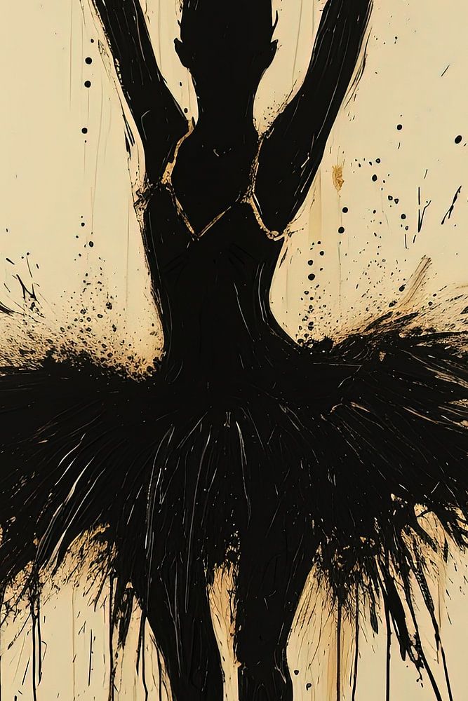 Der Kontrast zwischen der dunklen, fast schwarzen Gestalt der Tänzerin und dem hellen Hintergrund erzeugt einen dramatischen Effekt. Das Tutu der Ballerina scheint in einer chaotischen Wolke aus schwarzer Farbe zu explodieren und vermittelt ein Gefühl von Bewegung und Vitalität. Die Farbe wurde mit großem Strich und klarer Textur aufgetragen, was dem Bild Tiefe und Emotion verleiht.