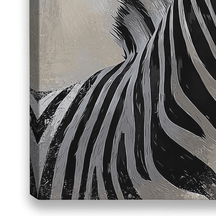 Ein Gemälde zeigt ein elegantes Zebra, dessen Streifen durch Kreidestriche hervorgehoben werden. Der raue, fast skizzenhafte Stil verleiht dem Kunstwerk ein organisches Gefühl, als wäre das Zebra auf der Leinwand eingefangen worden. Der Hintergrund ist minimalistisch, so dass die grafische Schönheit des Zebras und die Textur der Kreide…