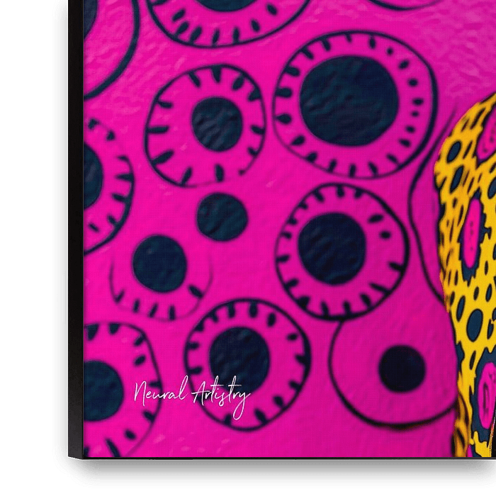 Entdecken Sie "Elegance" von Neural Artistry, ein atemberaubendes Pop-Art-Porträt, das die perfekte Verschmelzung von Stil und Kultiviertheit einfängt. Dieses visuelle Meisterwerk zeigt einen Mann mit durchdringendem Blick, der in ein einzigartiges, vibrierendes Muster gekleidet ist, das strahlende Gelbtöne und rosafarbene…