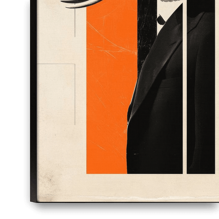 Ein majestätischer Elefantenkopf thront auf der Schulter eines stilvoll gekleideten Mannes, während lebendige orangefarbene und klare schwarze geometrische Formen eine faszinierende Komposition schaffen. Diese harmonische Verbindung zwischen Natur und Eleganz vermittelt eine kraftvolle Botschaft über Stärke, Anmut und die künstlerische…
