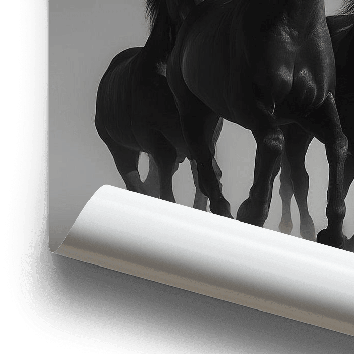 In einer monochromen, fast nebelhaften Landschaft schreitet eine elegant gekleidete Frau in einem langen, fließenden schwarzen Kleid voran. Hinter ihr galoppiert eine Gruppe schwarzer Pferde, kraftvoll und geschlossen, deren Bewegung Staub und Dynamik in die Szene bringt. Die Komposition wirkt wie ein Standbild aus einem epischen Film.…
