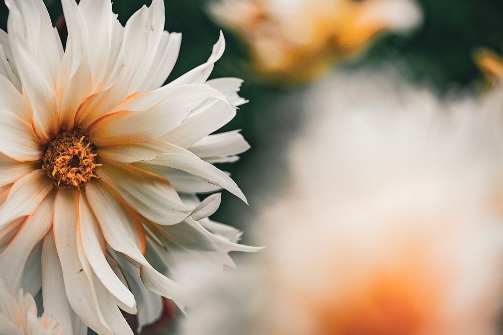 Die zarten weißen Blütenblätter dieser Dahlie werden von feinen orangenen Linien durchzogen, die sie wie gemalt erscheinen lassen. Umgeben von sanft verschwommenen Farbtupfern entsteht ein harmonisches Zusammenspiel aus Schärfe und Weichheit. Dieses Bild bringt natürliche Eleganz, Ruhe und eine warme Leichtigkeit an jede Wand.