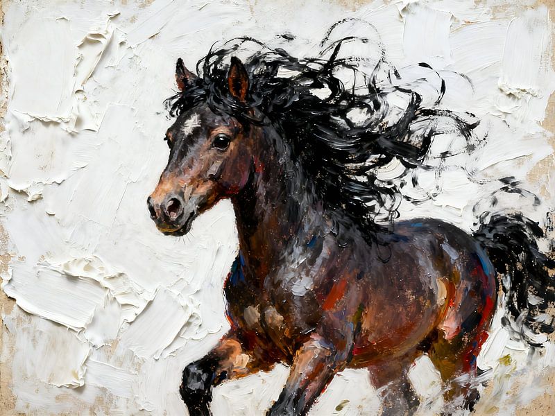 Dieses ausdrucksstarke Gemälde eines galoppierenden Pferdes verbindet Energie und Eleganz in einer kraftvollen Darstellung. Die dynamische Haltung des Tieres wird durch breite, gestische Pinselstriche betont, die Bewegung und Geschwindigkeit suggerieren. Die Farbpalette aus tiefen Brauntönen, Schwarz und akzentuierten Farbspritzern…