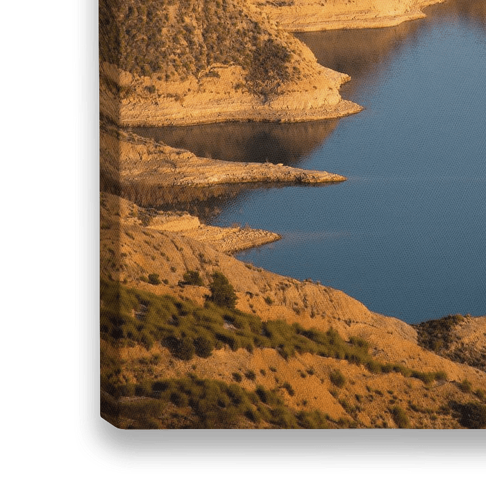 Blick auf die orangefarbenen Felsen des Negratin-Stausees, bei Sonnenuntergang in Granada, Spanien.