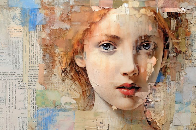 Emma Portrait - abstrakte Malerei / Mischtechnik gemalt. Schöner Kontrast zwischen anspruchsvollem Porträt und roher Collage/Maltechnik.