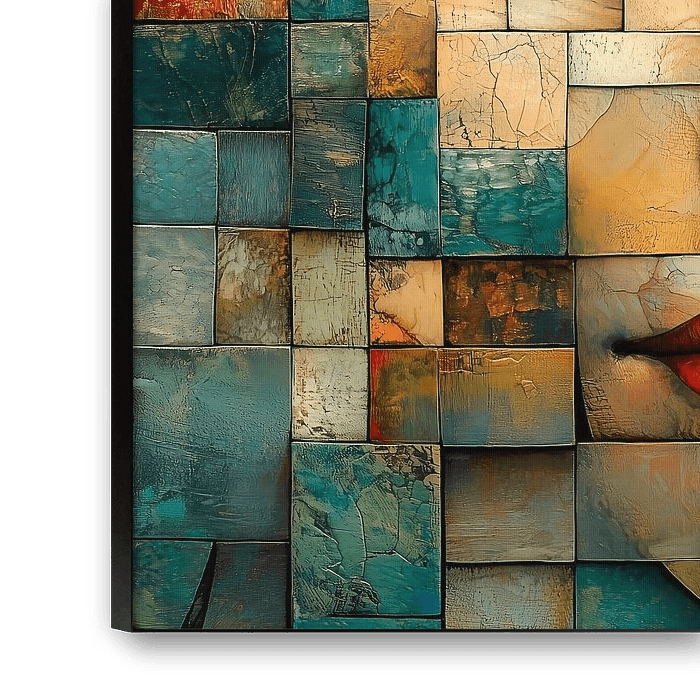Ein fesselndes Porträt eines Frauengesichts, das aus einem komplizierten Mosaik abstrakter geometrischer Formen in leuchtenden Farben besteht und die Komplexität der menschlichen Gefühle darstellt.