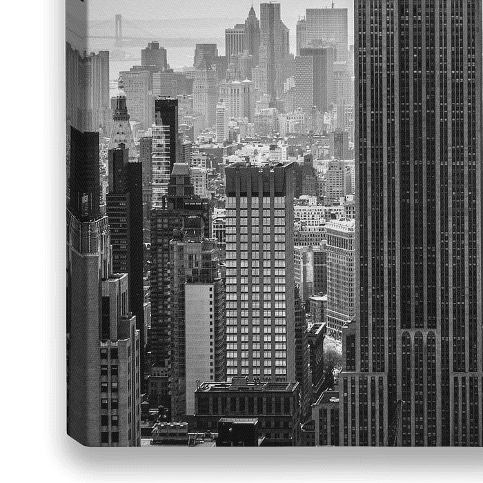 Schwarz-Weiß-Foto des Empire State Building, aufgenommen vom Rockefeller Building aus. Im Hintergrund sehen wir das neue World Trade Center.