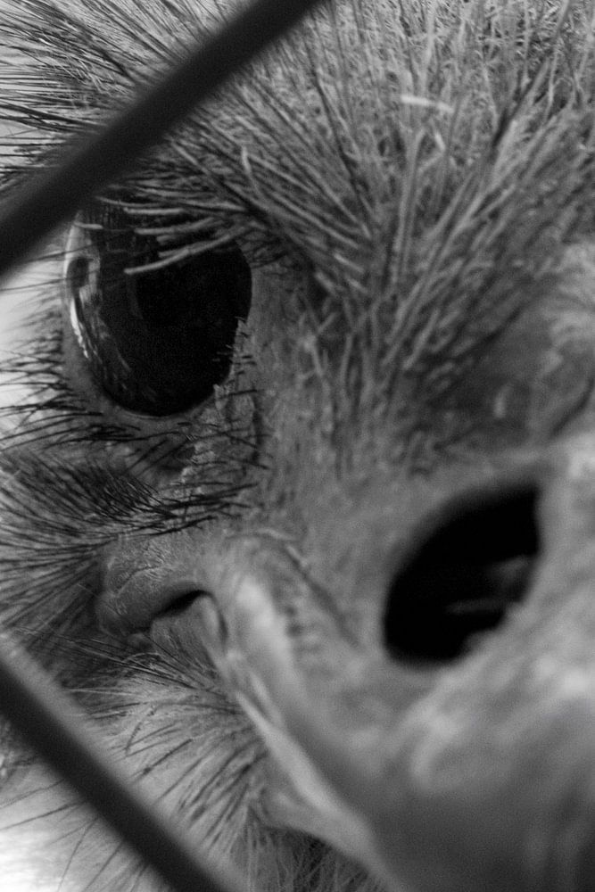 Dieses Schwarz-Weiß-Bild wurde auf der anderen Seite des Zauns aufgenommen. Der Vogel schaute mich wütend an und kam sehr nahe. So konnte ich diese Aufnahme machen, bei der man das Auge schön sehen kann.