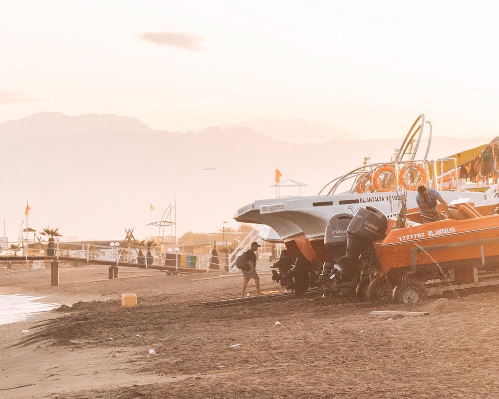Dieses Foto wurde bei einem Strandspaziergang bei Sonnenuntergang aufgenommen. Die Boote wurden an den Strand gehievt, und das Personal führte die letzten Kontrollen durch, bevor es nach Hause ging.