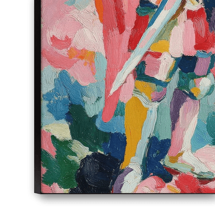 Dieses Kunstwerk zeigt den Erzengel Michael in Rüstung, mit Schwert und Schild, vor rosa Hintergrund und Wolken. Im Stil von Matisse umgesetzt, kombiniert die Ölmalerei kräftige, lebendige Farben, expressive Pinselstriche und fließende Formen. Die Darstellung vermittelt Stärke, Schutz und heroische Präsenz, während die harmonische Farbkomposition und die stilisierte Umsetzung den mythologischen Charakter betonen. Die Illustration verbindet klassische Ikonografie mit moderner, grafischer Interpretation, wodurch ein auffälliges, dekoratives Kunstwerk entsteht, das sowohl spirituelle Symbolik als auch künstlerische Energie und farbliche Intensität ausstrahlt.