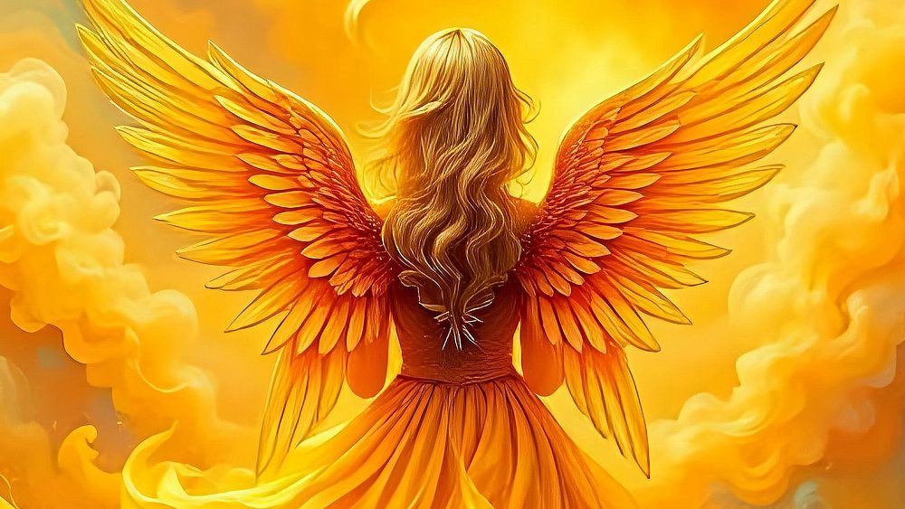 Das Hintergrundbild zeigt einen majestätischen Engel, der sanft inmitten von weichen, fließenden Wolken oder zartem Rauch schwebt. Die Figur des Engels strahlt eine Aura von Ruhe und Frieden aus, während sie in einer anmutigen Pose dargestellt ist. Die Wolken um ihn herum wirken fast ätherisch und schaffen eine traumhafte Atmosphäre, die den Betrachter in eine andere Welt entführt.