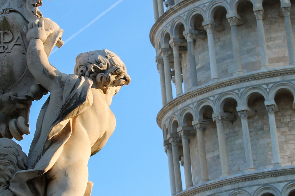 Diese Statue mit Putten oder Engeln steht neben dem Turm von Pisa. Der schiefe Turm und die Statue heben sich vor dem blauen Himmel ab. Der Marmor der Statue und des Turms leuchtet warm im Morgenlicht. Der Turm von Pisa ist auf dem Bild schön schief.