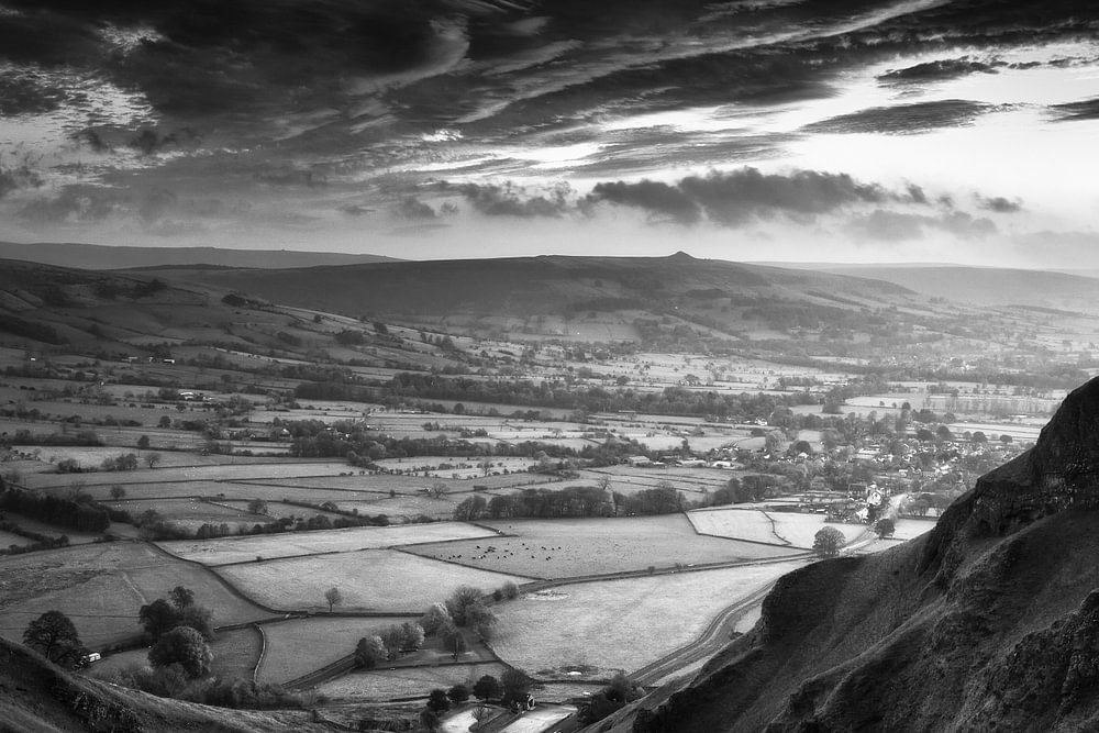 England Peak District mit dem Winnats Pass bei Sonnenaufgang in schwarz-weiß. Die Schlucht ist Teil des Bezirks Derbyshire. Dies ist eine der beliebtesten Ansichten im Peak District und ein bekannter Ort in der Landschaftsfotografie. In der Ferne liegt das Hope Valley.