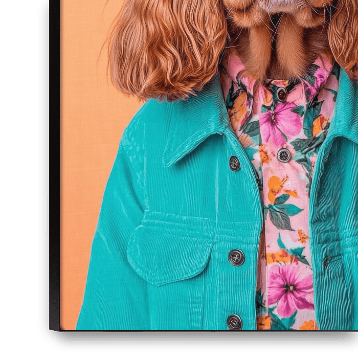 Mit seinen sanften, lockigen Ohren und dem strahlenden Blick versprüht dieser English Cocker Spaniel charmante lässige Eleganz. Die farbenfrohe Kleidung und die stylishe Mütze verleihen ihm einen modernen Touch, während sein aufmerksames Wesen und die verspielte Ausstrahlung die Lebensfreude verkörpern. Ein echter Blickfänger in jedem…