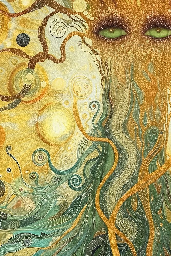 In "Ent of the Ancient Forest" wird ein mythischer Baum mit Augen zum Leben erweckt, der die Weisheit und Übersicht der Natur symbolisiert. Die leuchtenden Gold- und Aquamarin-Töne fließen in einem Tanz aus Licht und Leben zusammen, während die kreisförmigen Motive ein Gefühl von Mystik und Ewigkeit ausstrahlen. Der Baum scheint ein stiller Wächter zu sein, dessen Äste sich nach dem Licht ausstrecken und dem Stück eine einzigartige Präsenz in jedem Raum verleihen, den es schmückt. Dieses Werk ist eine Hommage an die Geschichten und Legenden, die die Natur in unserer Fantasie hervorruft.