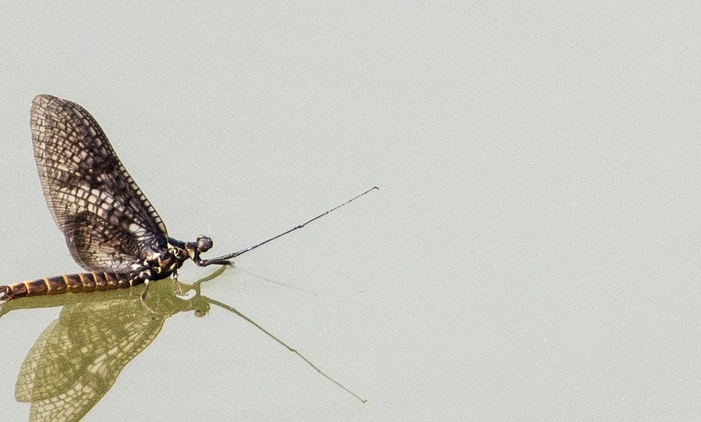 Tanzen auf dem Wasser, eine Eintagesfliege. An einem schönen Sommermorgen . Ein schlankes Insekt mit zartem Körper, sehr speziell.