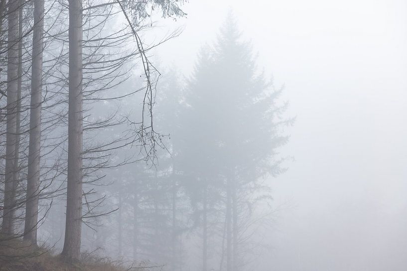 Nebel im Wald. Eine Szene, eingefangen in dichter Stille.