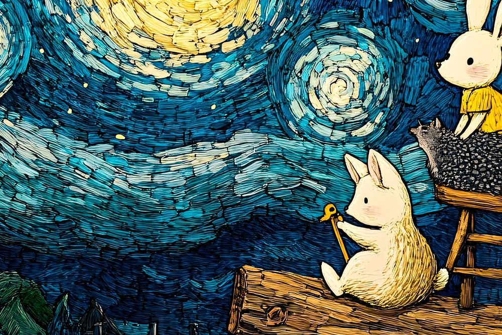 Bringen Sie einen Hauch von Magie in Ihre Innenräume mit diesem einzigartigen Design. Es zeigt zwei niedliche Kaninchen, die sich gemeinsam an einem wunderschönen Sternenhimmel erfreuen, inspiriert von einem post-impressionistischen Stil. Die tiefen Blau- und Gelbtöne verleihen dem Kunstwerk ein dynamisches und warmes Aussehen. Dieses Kunstwerk eignet sich perfekt für ein Wohnzimmer oder einen Hobbyraum und bringt ein Gefühl von Ruhe und Kreativität in jeden Raum. Ideal für Tier- und Kunstliebhaber auf der Suche nach etwas Einzigartigem.