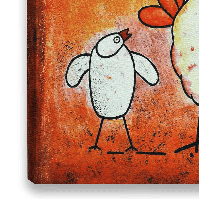 Eines von zwei Hühnerbildern, die zu einer Serie von Tieren gehören, die für einen Verlag in Auftrag gegeben wurde. Die gesamte Serie besteht aus 10 Bildern. In Schichten mit Acryl gemalt. Dann wurde mit Stempeln und schwarzer Acrylfarbe gearbeitet.
