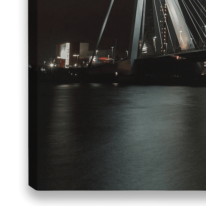 Die Erasmusbrücke am Abend fotografiert, die beleuchtete Brücke kommt am Abend sehr schön zur Geltung.