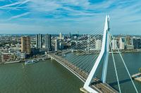 Die ikonische Erasmus-Brücke in Rotterdam. Hier aus der Vogelperspektive, mit der internationalen Skyline der Rotterdamer Innenstadt im Hintergrund.