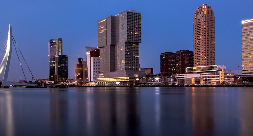 Kop van Zuid mit der Erasmusbrücke in Rotterdam während der blauen Stunde