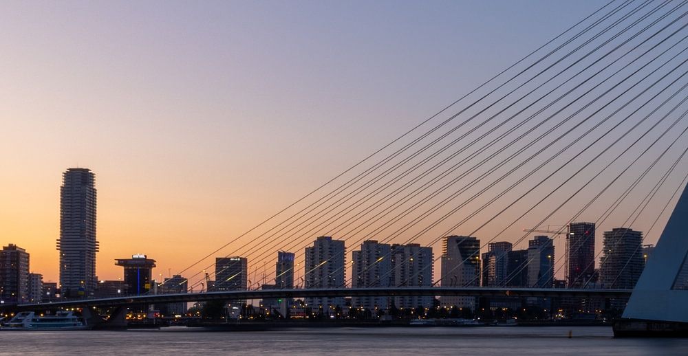Vom Kop van Zuid, der übrigens auch eine sehr fotogene Skyline ist, überblickt man die Erasmusbrücke und die Skyline des Rotterdamer Stadtzentrums. Die untergehende Sonne verleiht dem Ganzen eine warme Farbe und Atmosphäre.