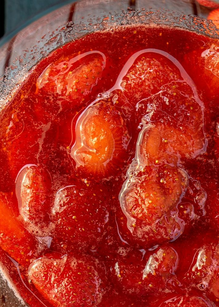 Erdbeerkompott in einer Glasschale auf einem hölzernen Gartentisch.