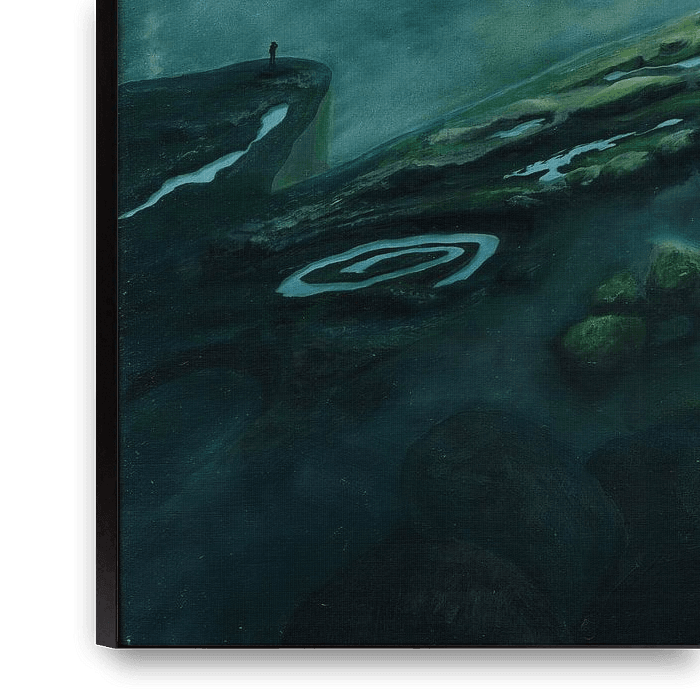 Das Gemälde präsentiert eine bemerkenswerte Darstellung der Tiefe, die den Blick des Betrachters in die Ferne zieht und neue Ebenen der Landschaft offenbart. Die feine Maltechnik zeigt entlang der Horizontlinie eine Vielzahl von dreieckigen Erhebungen, die mit Ölfarben auf Leinwand gemalt wurden.
