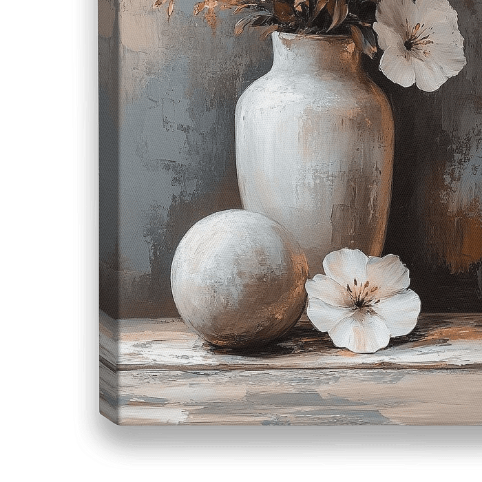 Details: Stillleben, abstrakt, modern, Blumen, Vase, weiße Blumen, rundes Objekt, Kunst, Interieur, Dekoration