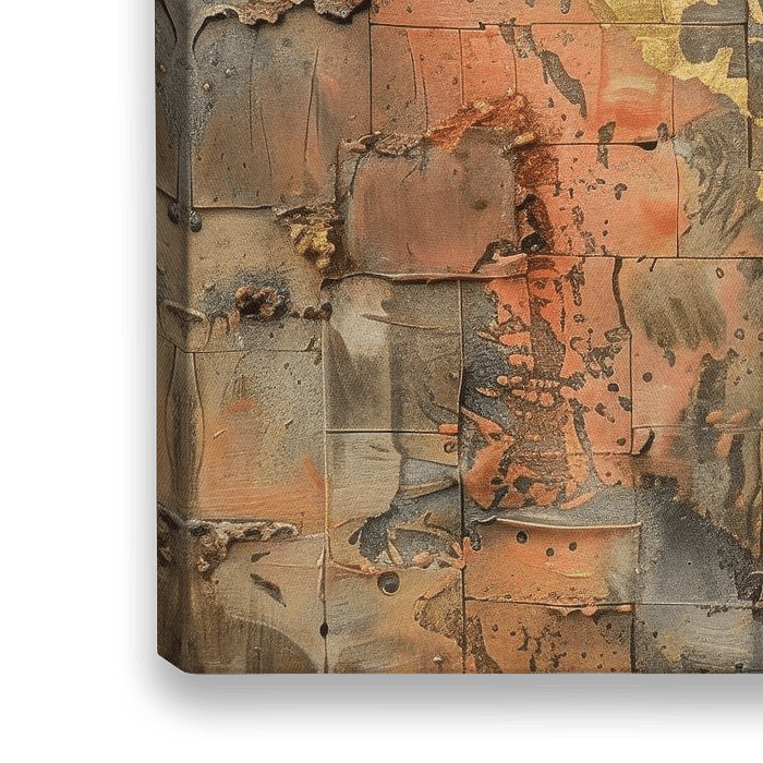 Eine abstrakte Weltkarte in satten Erdtönen und mit einer verwitterten, authentischen Optik. Ideal für industrielle, Vintage- und klassische Innenräume und ein echter Hingucker in Wohnzimmer, Büro oder Arbeitszimmer. Dieses Kunstwerk strahlt Reise, Geschichte und Charakter aus.