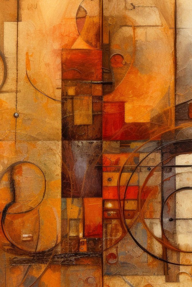 Ein Rhythmus aus Kreisen und geometrischen Flächen in warmen Erdtönen. Dunkle Rost- und Orangetöne verschmelzen mit Beige und Braun und schaffen ein dynamisches und zugleich beruhigendes Kunstwerk, das jedem Interieur Wärme verleiht.