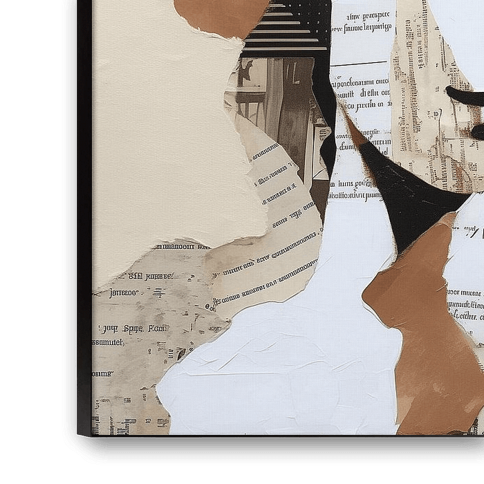 Die neutralen Farben in Kombination mit den Textfragmenten und Mustern suggerieren eine Geschichte oder einen historischen Kontext. Die Komposition spielt mit der Idee von Identität und Erinnerung, wobei die Fragmente zusammen ein neues Bild ergeben.
