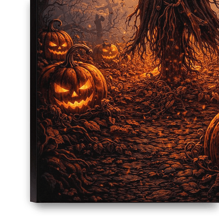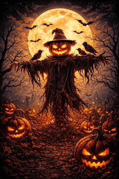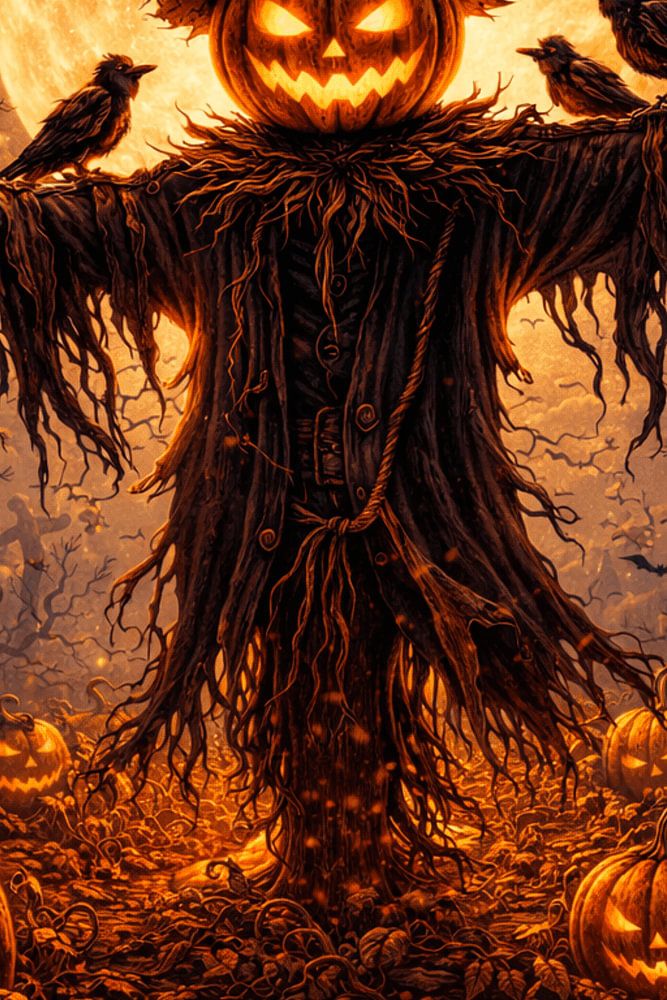 Eine unheimliche Vogelscheuche mit einem leuchtenden Kürbiskopf steht Wache in einem mondbeschienenen Kürbisfeld. Umgeben von Fledermäusen und Krähen bringt dieses düstere Herbstkunstwerk eine gespenstische Ernteatmosphäre in jeden Raum.
