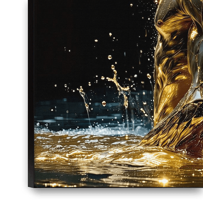 Bestelle dieses abstrakte Wandbild Erotische Kunst – Nackter Mann duscht im Regen aus flüssigem Gold – Der in Strahlkraft getauchte Körper zwischen Hingabe, Verwandlung und leiser Erotik von AidasignArt als Reproduktion auf Leinwand, Alu-Dibond, als Poster, Fototapete oder Acrylglasbild.