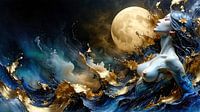 In diesem faszinierenden Werk begegnet uns eine weibliche Gestalt von fast ätherischer Präsenz – als sei sie aus weißem Marmor und Licht selbst geboren. Blaue, weiße und goldene Strömungen durchziehen den dunklen Hintergrund und formen ein Antlitz, das sich bis zu den entblößten Brüsten erstreckt. Die Figur rechts im Bild wendet den…
